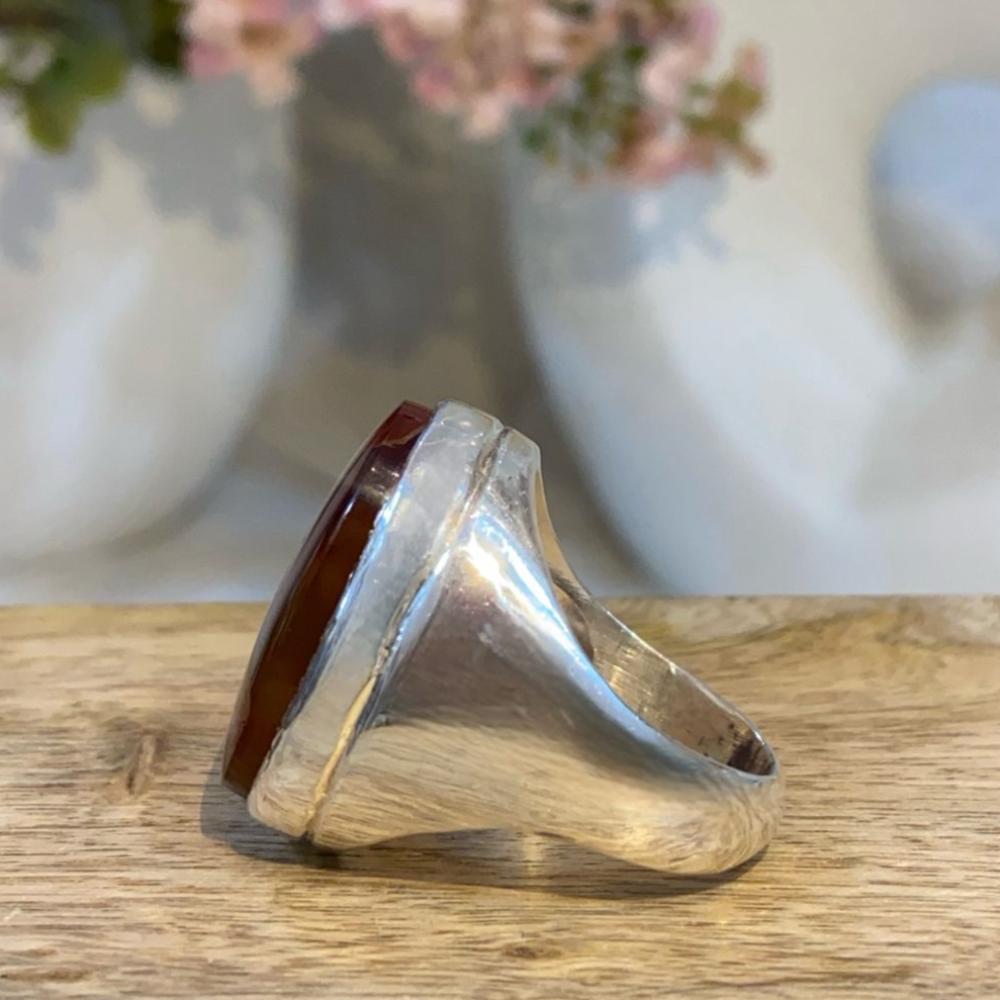 خاتم رجالي فاخر بحجر عقيق يماني طبيعي أصيل، يتميز بجمال نقوشه وألوانه المميزة.