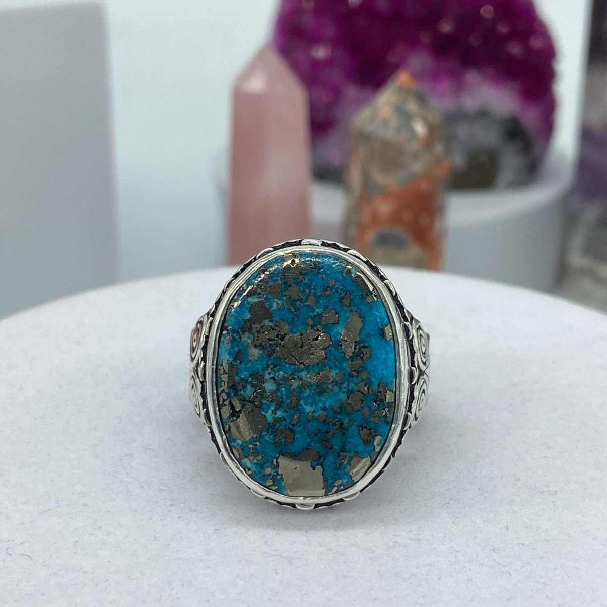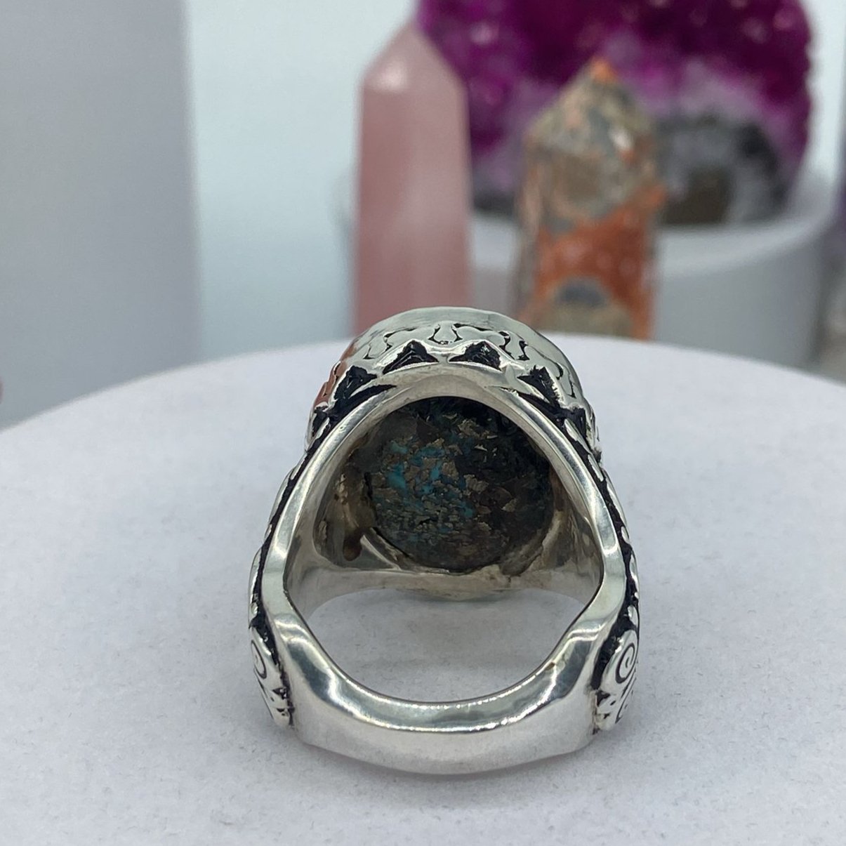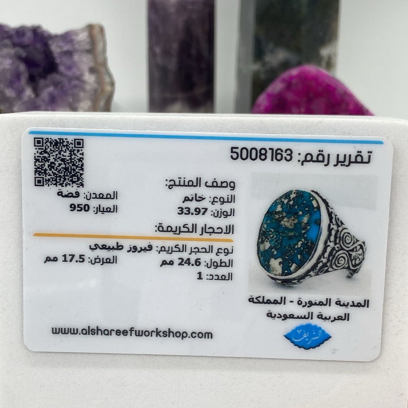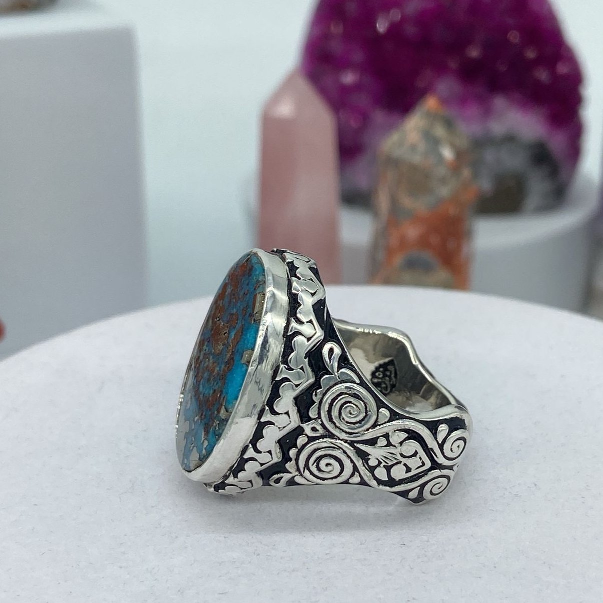 خاتم رجالي فاخر يتوسطه حجر فيروز كرماني طبيعي بلونه الاخضر السماوي المميز وعروقه العفوية الساحرة، مصاغ على قاعدة من فضة عيار 950 بتصميم شرقي أنيق يناسب الرجل ذو الذوق الرفيع. قطعة تعبّر عن الأصالة والفخامة وتُضفي لمسة مميزة على الإطلالة اليومية والمناسبات الخاصة.