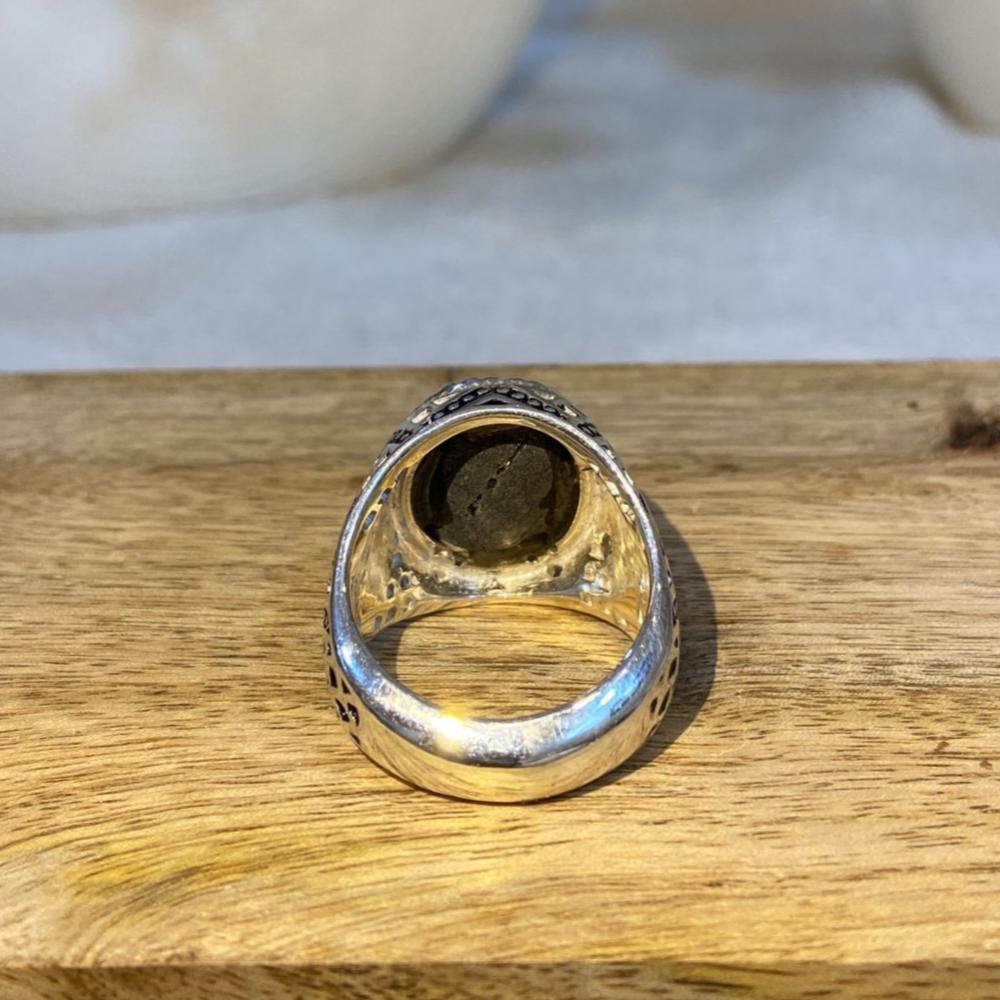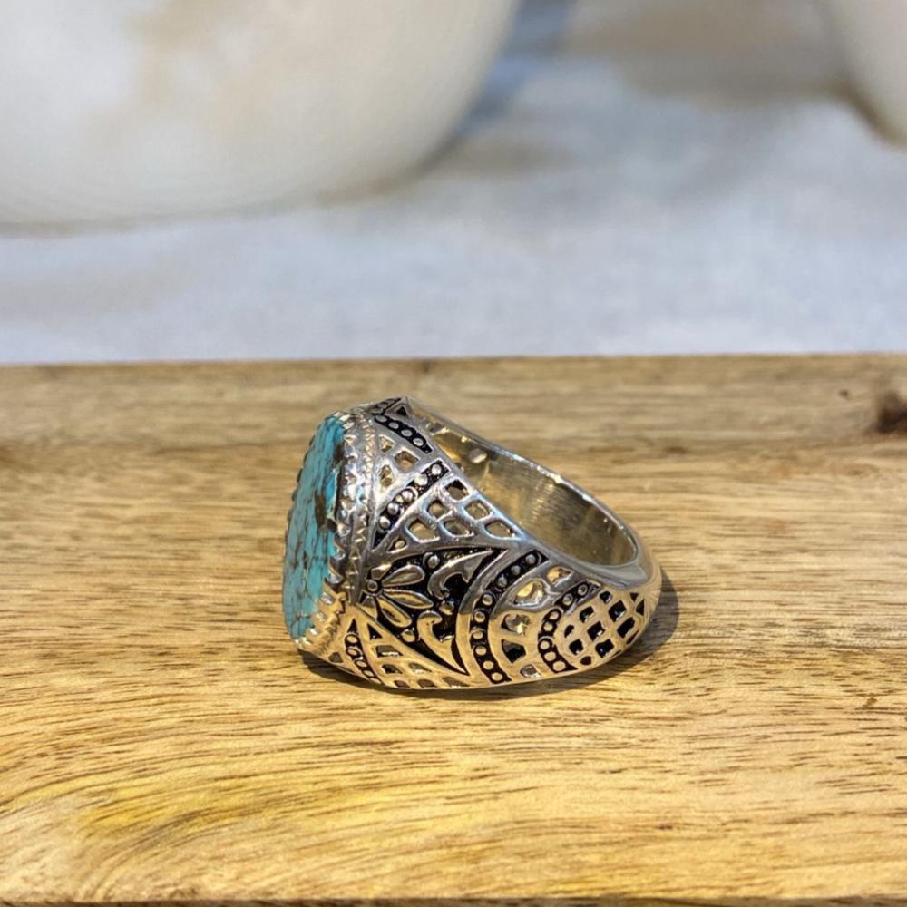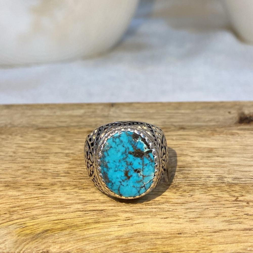 خاتم رجالي فاخر يتوسطه حجر فيروز نيشابوري طبيعي بلونه الأزرق السماوي المميز وعروقه العفوية الساحرة، مصاغ على قاعدة من فضة عيار 950 بتصميم شرقي أنيق يناسب الرجل ذو الذوق الرفيع. قطعة تعبّر عن الأصالة والفخامة وتُضفي لمسة مميزة على الإطلالة اليومية والمناسبات الخاصة.