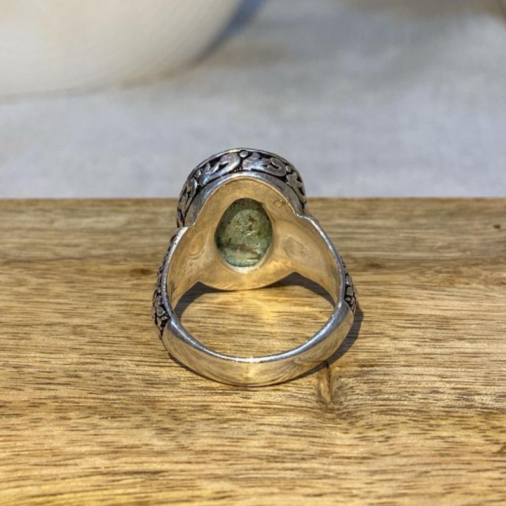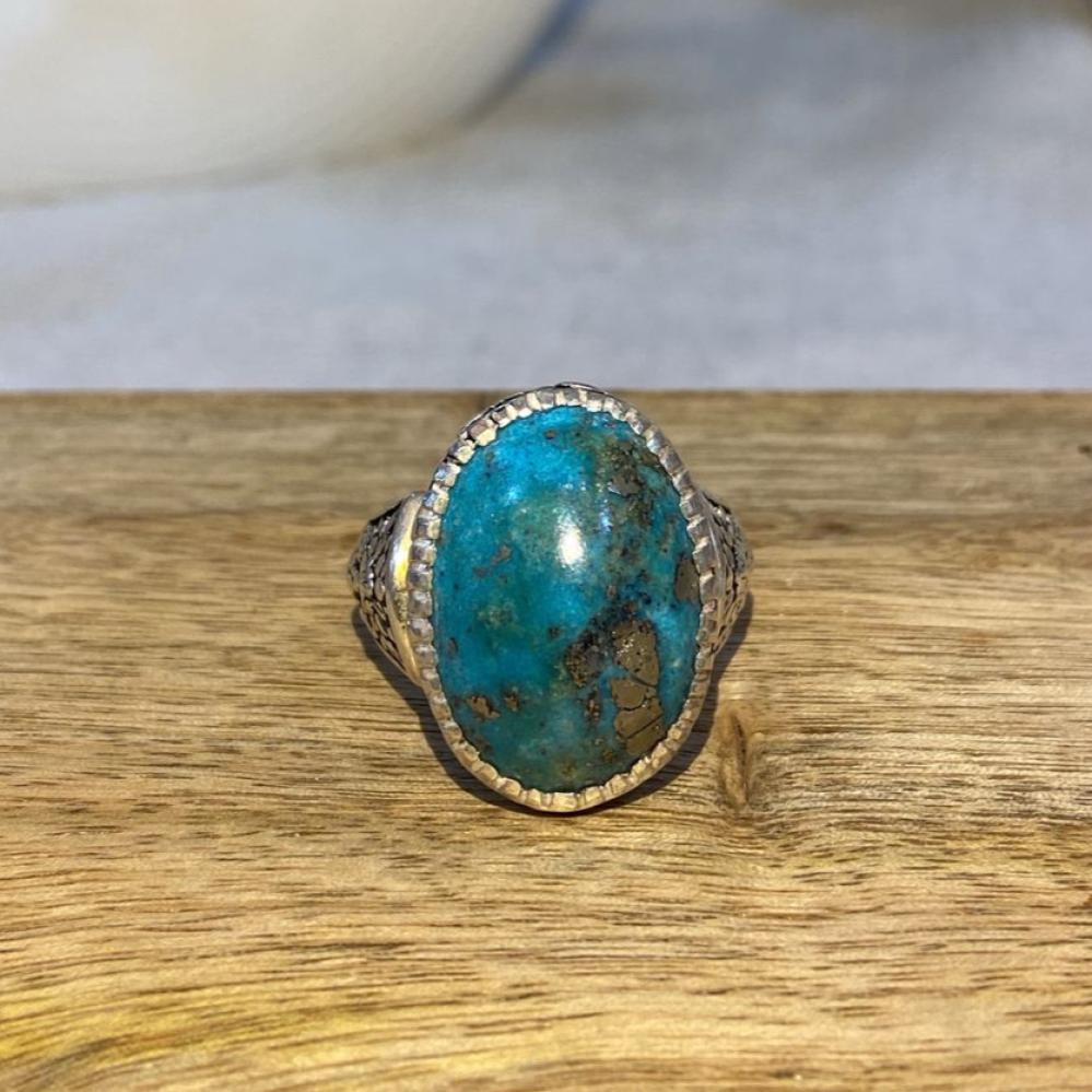 خاتم رجالي فاخر يتوسطه حجر فيروز نيشابوري طبيعي بلونه الأزرق السماوي المميز وعروقه العفوية الساحرة، مصاغ على قاعدة من فضة عيار 925 بتصميم شرقي أنيق يناسب الرجل ذو الذوق الرفيع. قطعة تعبّر عن الأصالة والفخامة وتُضفي لمسة مميزة على الإطلالة اليومية والمناسبات الخاصة.