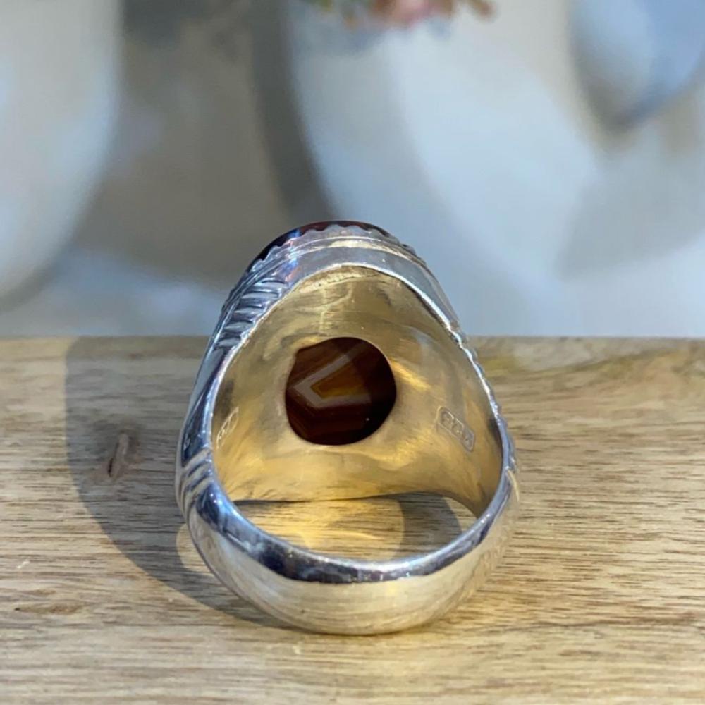 خاتم رجالي أنيق يتوسطه حجر عقيق يماني مجزع طبيعي يتميز بتدرجاته وخطوطه الفريدة، مصاغ على قاعدة من فضة 925 مصقولة بجودة عالية.