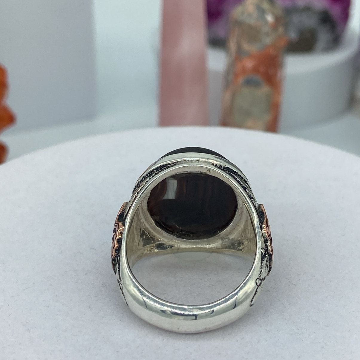 خاتم رجالي فاخر يتوسطه حجر العقيق المجزع اليماني الطبيعي المعروف بتداخل ألوانه الفريدة وخطوطه العشوائية التي تمنح كل قطعة تفرّدها.