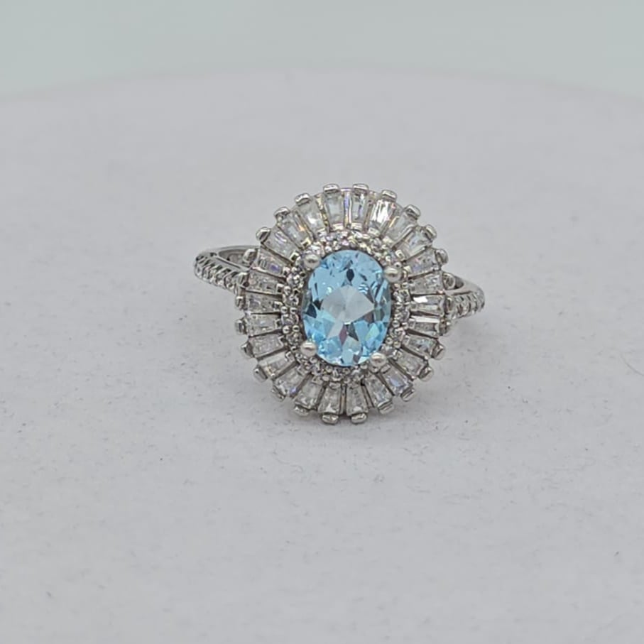 خاتم نسائي راقٍ مصنوع من الفضة الخالصة عيار 925، يتوسطه حجر توباز طبيعي بلونه السماوي الجذاب الذي يرمز للصفاء والهدوء والطاقة الإيجابية.