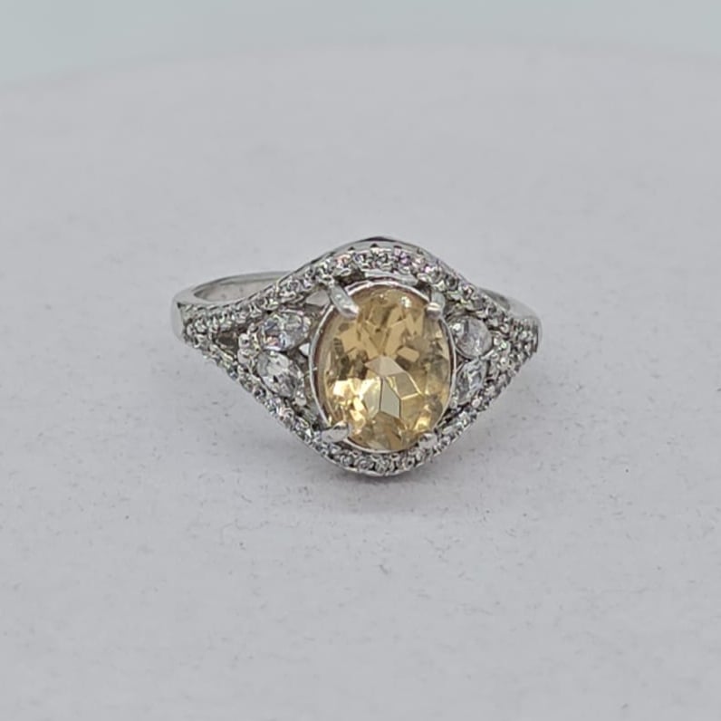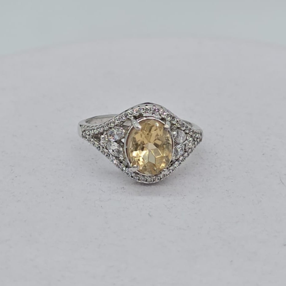 خاتم نسائي أنيق من الفضة الخالصة عيار 925، تتوسطه لمسة دافئة من حجر السترين الطبيعي المعروف بلونه الذهبي الجذاب الذي يرمز إلى البهجة والطاقة الإيجابية والوفرة.