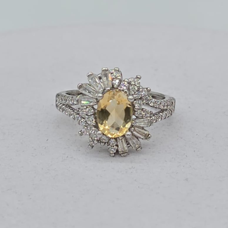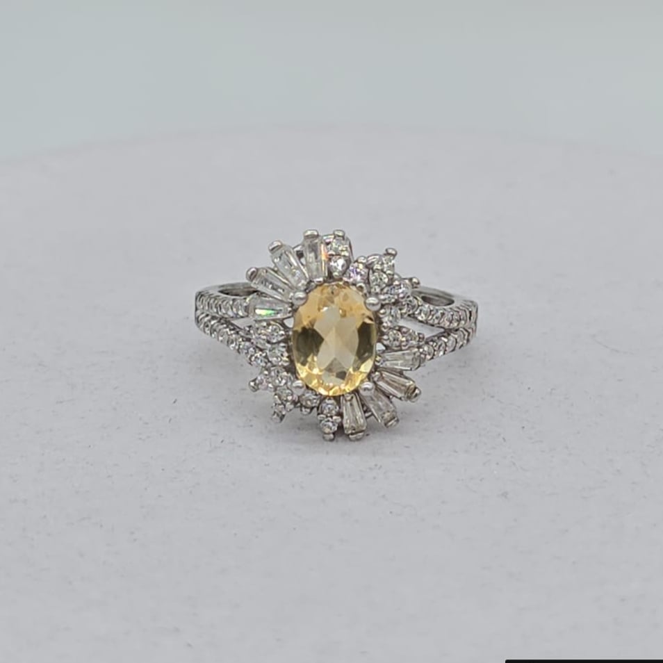 خاتم نسائي أنيق من الفضة الخالصة عيار 925، تتوسطه لمسة دافئة من حجر السترين الطبيعي المعروف بلونه الذهبي الجذاب الذي يرمز إلى البهجة والطاقة الإيجابية والوفرة.