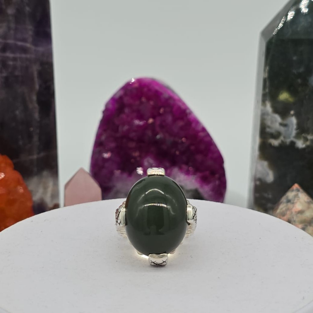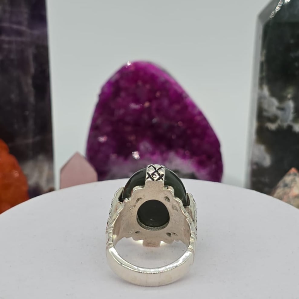 خاتم رجالي فاخر يتوسطه حجر يشم يماني طبيعي يتميز بلونه الأخضر العميق وملمسه الناعم، ما يمنحه حضورًا راقيًا وفخامة خاصة.