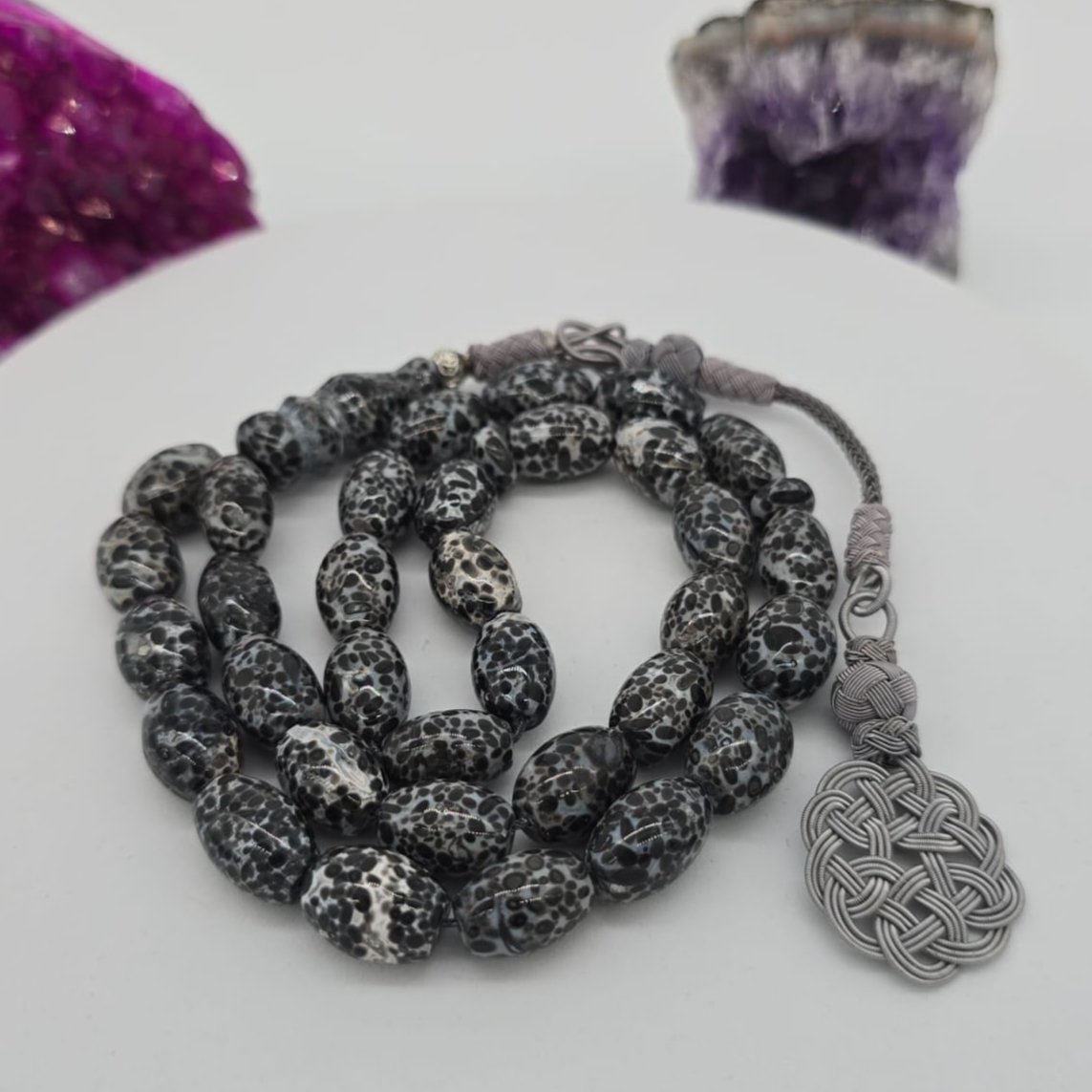 سبحة مميزة مصنوعة من جلد الحية الطبيعي بحبات متقنة الصنع ولمسة استثنائية تعكس الجرأة والقوة. تصميمها الفريد يمنحها طابعاً رجولياً مهيباً، مع خيط متين وصياغة دقيقة لتدوم طويلاً وتكون رفيقة أنيقة في المجالس والمناسبات. قطعة تحمل الأصالة مع لمسة عصرية لعشاق التميز.