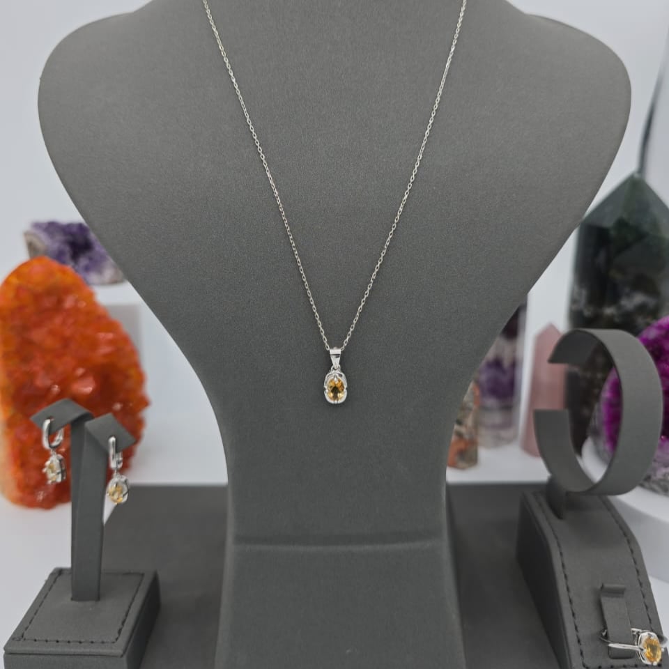 طقم أنيق يجمع بين لون السترين الطبيعي الدافئ و اللامع، مكون من قلادة، خاتم، وأقراط مصممة بعناية على قاعدة من فضة عيار 925 مطلية روديوم لضمان لمسة فخمة ومتانة طويلة الأمد. تصميم مثالي لإطلالة مشرقة وجذابة في المناسبات الخاصة.