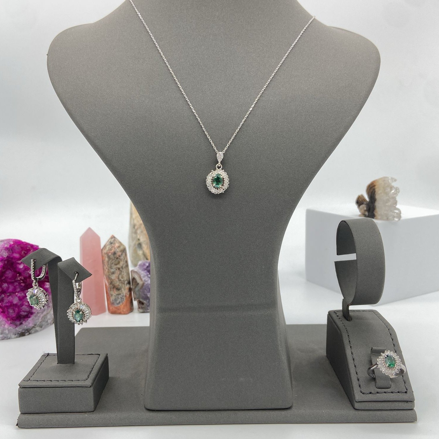 طقم نسائي متكامل يضم قلادة، أقراط وخاتم مرصعة بحجر الزمرد الطبيعي، مصنوع من فضة عالية الجودة لتضفي لمسة فخامة ورقي على إطلالتك اليومية والمناسبات الخاصة.